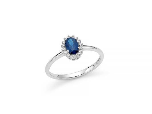 Anello in oro bianco 18 kt con zaffiro blu ovale incorniciato dalla luce di 16 preziosi diamanti.