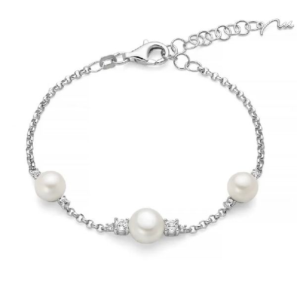 Realizzato in argento 925 placcatura rodio silver – Il bracciale, caratterizzato da una maglia a catena, è impreziosito da tre perle bianche coltivate di acqua dolce a bottone di cui: la centrale, più grande, dal diametro di 8-8,5 mm, mentre le due ai lati, più piccole, dal diametro di 7-7,5 mm e valorizzato con otto topazi bianchi naturali per una caratura complessiva di 0,46 ct – Chiusura con moschettone – Lunghezza regolabile da 15,5 a 19,5 cm