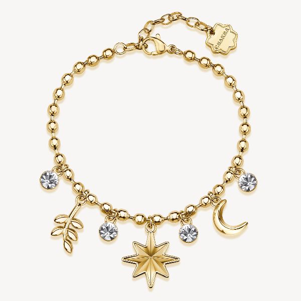 Bracciale in acciaio 316L e finitura pvd oro 14K, con rosa dei venti, ramo della pace, luna e cristalli.