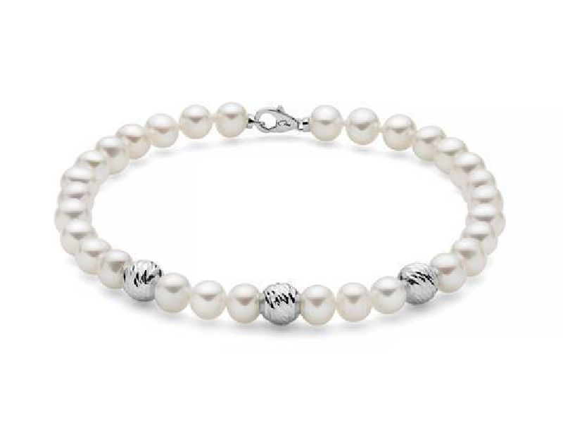Bracciale Miluna in oro bianco 9kt composto da filo di perle bianche di diametro 5-5,5 e impreziosito da tre sfere effetto diamantato.