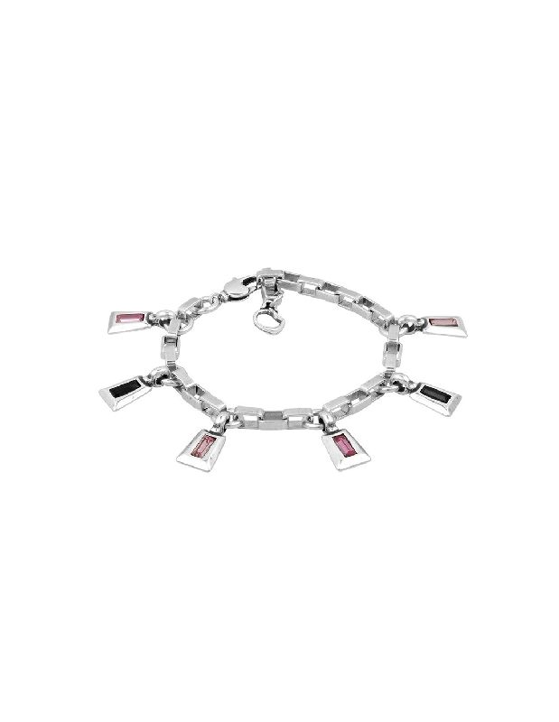 Bracciale Diversia della collezione Art Déco di Ciclón 1998. Realizzato in metallo placcato argento con catena dritta e ciondoli pendenti dal design geometrico decorati con cristalli sfaccettati. Disponibile in tre combinazioni di colori: blu, rosa e grigio fumo. Taglia unica, fino a 20 cm.