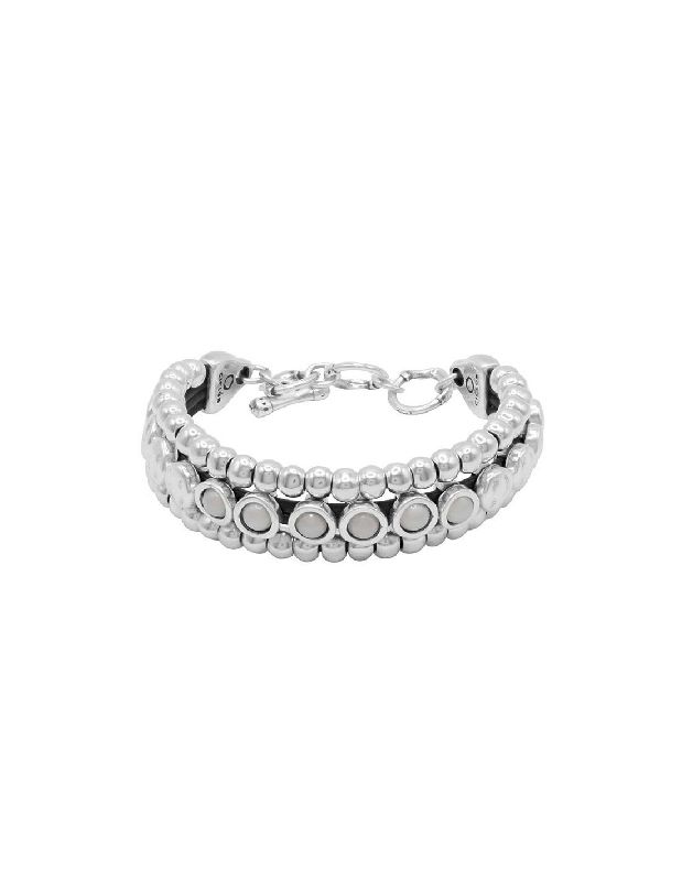 Bracciale triplo Divino placcato argento della collezione New Cocco di Ciclón, ispirato all’iconica stilista Coco Chanel. Con tre file di sfere in pelle e decorazioni in vetro di Murano. Taglia unica, da 17 a 20 cm. Disponibile in 5 colori. Chiusura a T.