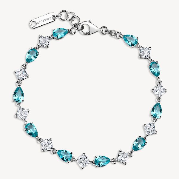 Bracciale in argento rodiato 925‰ con square cubic zirconia chiari e pear cubic zirconia colore paraiba.