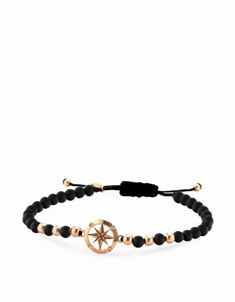 Bracciale in cordino con sfere in onice e oro rosa 18 kt, rosa dei venti e diamanti.