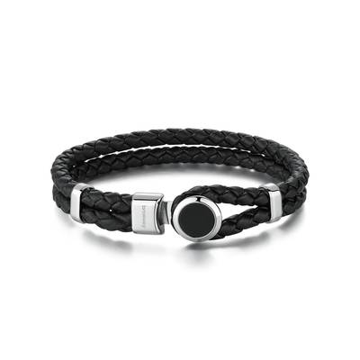 Bracciale in pelle di colore nero con elementi in acciaio 316L e onice nera satinata.