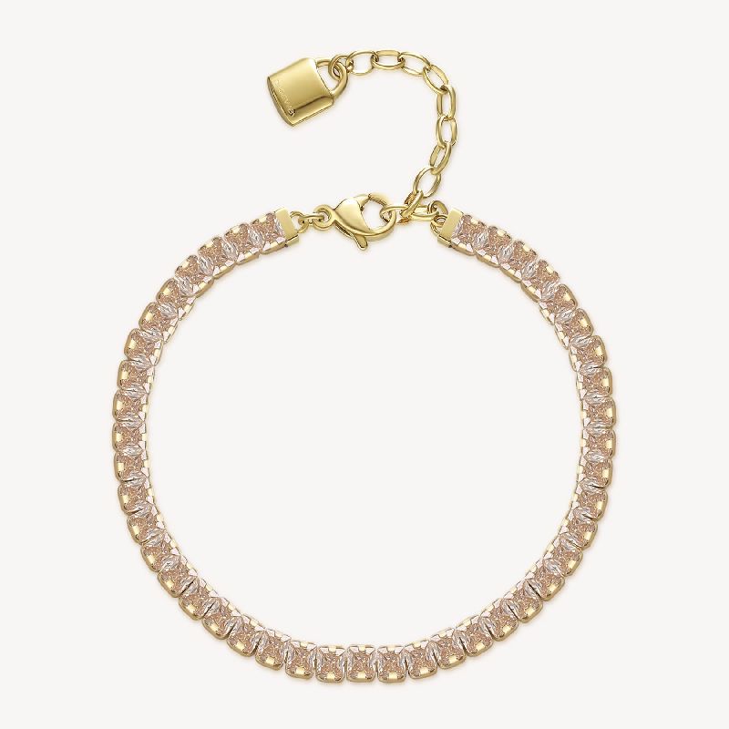 Bracciale tennis in acciaio 304 e finitura color oro con cubic zirconia quadrati champagn e pendente chiusura a forma di lucchetto.