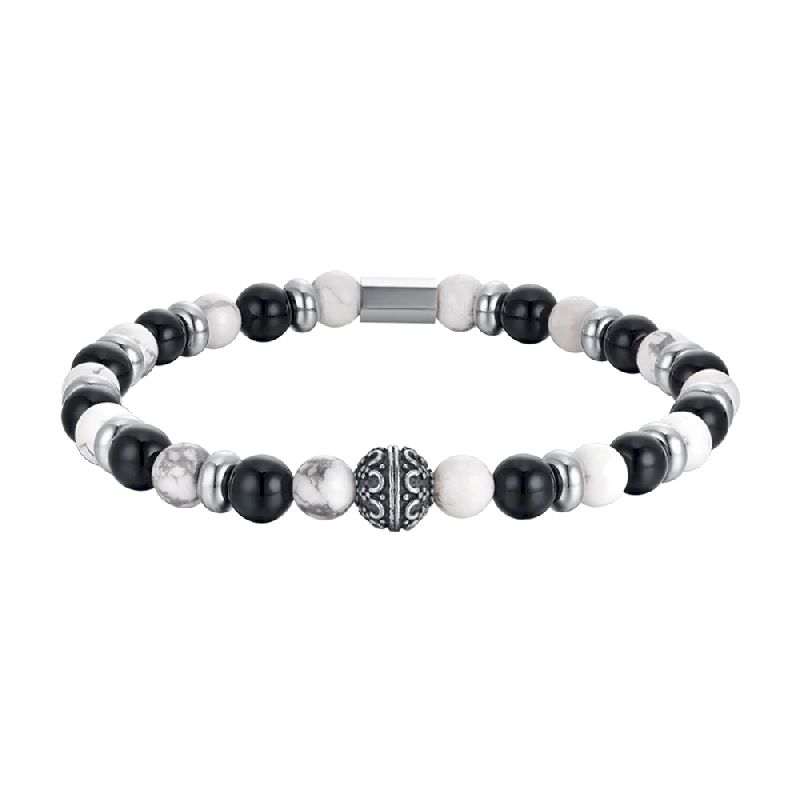BRACCIALE UOMO ELASTICO CON PIETRE NERE E BIANCHE ED ELEMENTI IN ACCIAIO