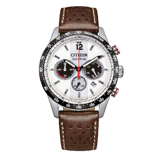 Il Citizen OF Collection 2026 Vintage Racing reinterpreta l’estetica delle competizioni d’epoca con tecnologia Eco-Drive: la carica solare garantisce un’autonomia straordinaria di 270 giorni, eliminando la necessità di sostituire batterie. Il cronografo con precisione al 1/5 di secondo impreziosisce il quadrante bianco a righe ispirato ai circuiti storici, racchiuso in una cassa in acciaio da 39mm con fondello a vite. Il cinturino in pelle marrone e la resistenza all’acqua fino a 100 metri rendono questo segnatempo il compagno ideale per chi cerca l’autenticità del vintage unita all’affidabilità contemporanea, perfetto tanto per il tempo libero quanto per occasioni informali eleganti.