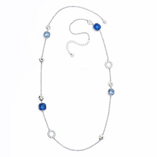 Collana catena rolò con cristalli multi-tone sapphire con frame increspato, beads in brass rodiato e dischi con zirconi clear – misura regolabile