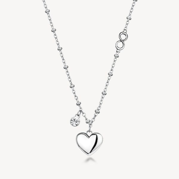 Collana in acciaio 316L con pendenti a forma di cuore, cristallo e simbolo infinito.