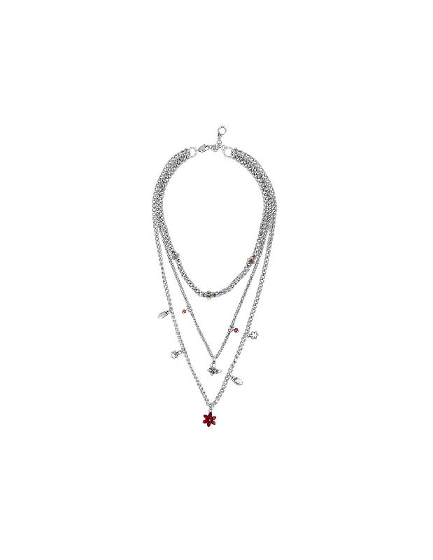 Collana corta a tre fili con fiori, farfalle, foglie… e un bellissimo fiore rosso in vetro di Murano all’estremità. La collana è lunga 50 cm.