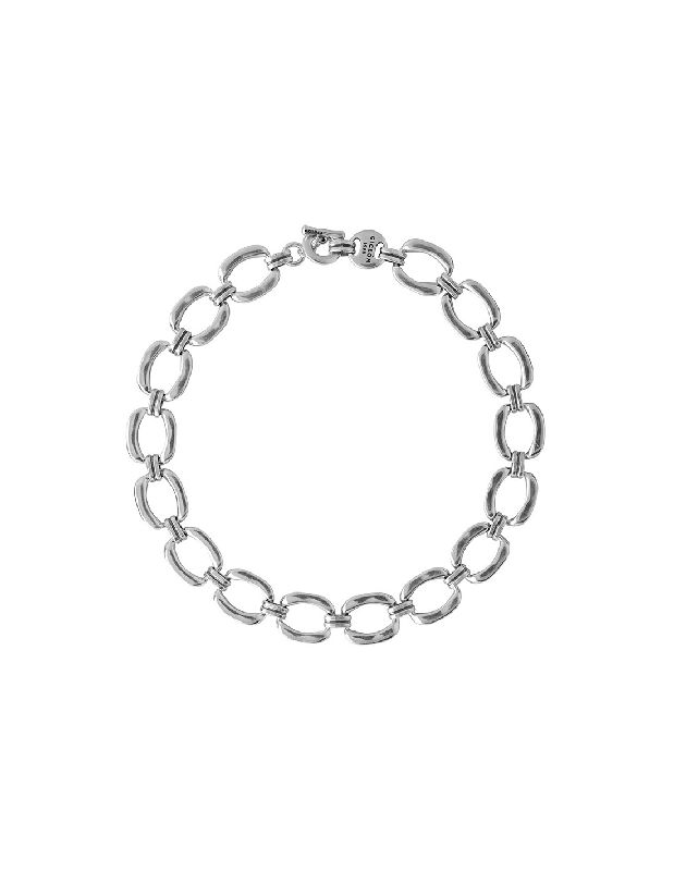 Collana corta Greta a maglie argentate della collezione Valérie. Design geometrico con 16 maglie quadrate da 20 mm e linee morbide. La collana misura 45 cm. Chiusura a T.