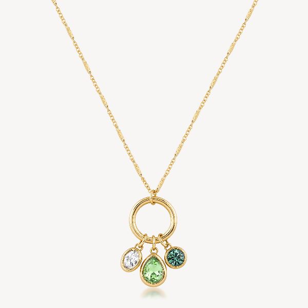 Collana in acciaio 316L e finitura pvd oro 14K con pendente centrale composto cristalli a forma di goccia, ovale e tondo nei colori bianco, erinite e chrysolite.