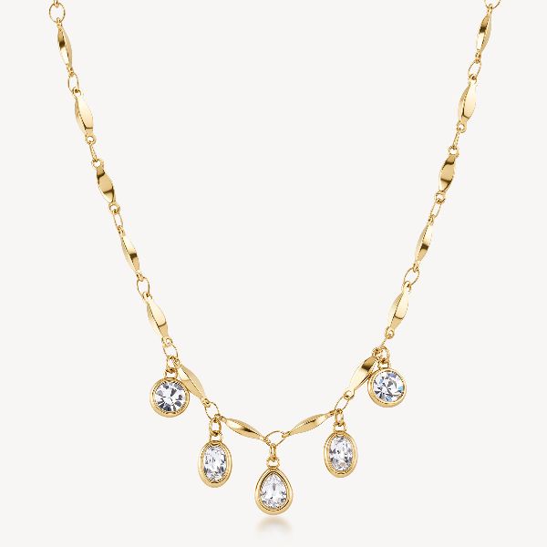 Collana in acciaio 316L e finitura pvd oro 14K e cristalli a forma di goccia, ovale e tondo.