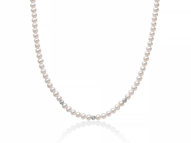 Collana con perle coltivate diametro 4.5/5 mm e 1 perla 7/7.5 mm; 3 sfere boule in oro bianco 750/00 (18 kt). La chiusura è in oro bianco 750/00 (18 kt). La lunghezza della collana è di 45 cm. Referenza: PCL6317