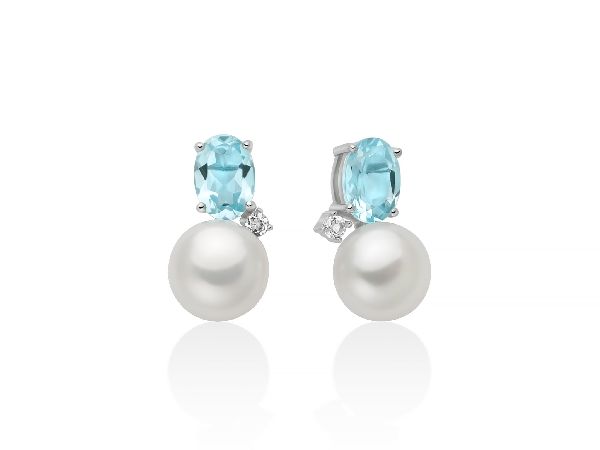 2 perle vere Oriente bottone 8-8,5 mm, 2 topazi azzurri naturali taglio ovale 7×5 mm 2 ct, 2 topazi bianchi naturali taglio rotondo 0,08 ct totali.