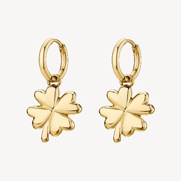 Orecchini pendenti in acciaio 316L e finitura pvd oro 14K, con quadrifoglio.