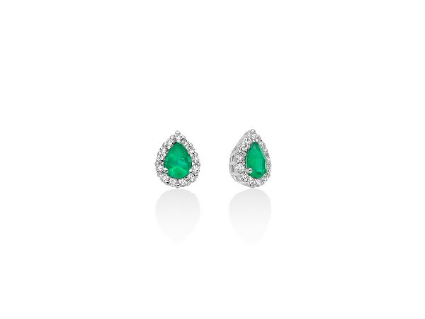 Questi orecchini in oro bianco 750 sono realizzati con smeraldi taglio goccia contornati di diamanti naturali. Un gioiello che illumina lo sguardo con il verde intenso dei diamanti, unito alla preziosità dei diamanti.