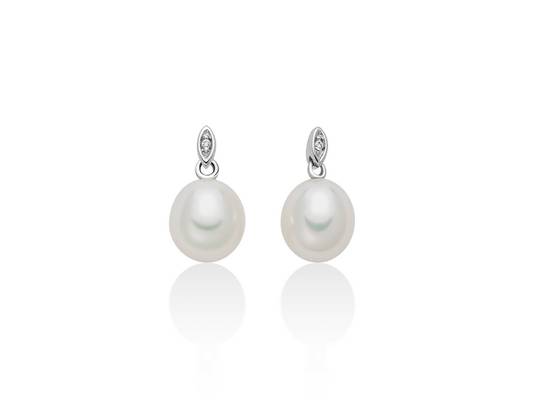 Gli orecchini sono in oro bianco 375‰ (9Kt) impreziositi da 2 diamanti naturali taglio brillante rotondo con caratura totale di 0,0056 – colore G – purezza SI e da due perle bianche vere di diametro ø 6,5/7.