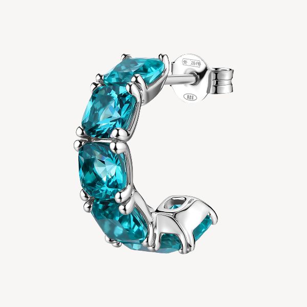 Orecchino singolo a cerchietto in argento rodiato 925‰ con cushion cubic zirconia colore paraiba.